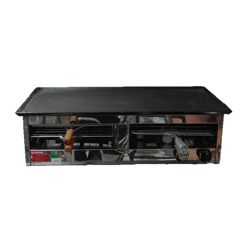 (REJAS DE FUNDICIÓN) Acero inoxidable 430 esmerilado. Cámara de cocción enlozada con piso de tejuelas. 3 Rejillas internas extraíbles de 43 X 44 cm. Bandejas antiderrame de acero inoxidable. Mecheros de aluminio. 24.000 Calorías